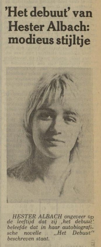 “Hester, introduced at the age of sixteen in the Amsterdam “De Kring” and no stranger to the capital artist world, came into contact with the young publisher Peter Loeb through Hans Sleutelaar, who had read some of her work and saw something in it. This encouraged her to write the novella. The Debut, supplemented with more childhood memories, is to be made into a film next spring under the direction of Nouchka van Brakel.