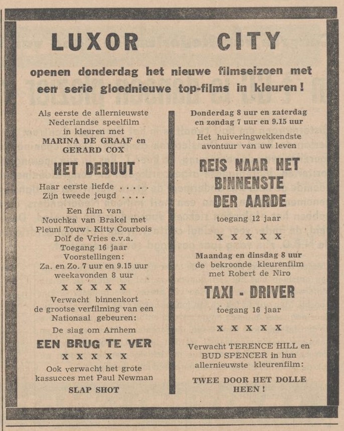 “The Debut is produced for half a million guilders, a low-budget film, with a contribution from the Dutch Production Fund. The cast also includes Pleuni Touw, Kitty Courbois and Dolf de Vries. The crew features Nouchka’s husband, Theo van der Sande. Filming will be completed within six weeks. It is filmed at locations in Amsterdam-Zuid and in the Belgian seaside resort of Knokke. The film will be released by Tuchinski in 1977. Hester Albach’s novel was rewritten into a script by Karel Donck and Van Brakel. An attempt to find someone through a call in newspapers and television had done little. Marina de Graaf was eventually suggested by friends. Nouchka van Brakel and Hester Albach are very enthusiastic about this choice: Marina even seems to look like Hester. Marina never had plans to be an actress, she says and she just read the book last week. Playing the lead role in the film adaptation seems to her to be a lot of fun to do. And other than that, she’ll see.”