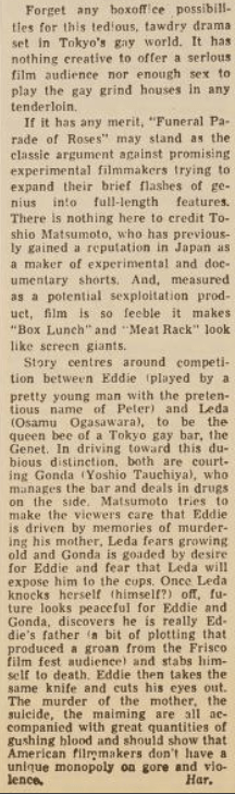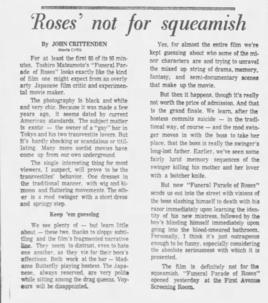 Toshio Matsumoto, one of the great cinematic rebels and non-conformists, passed away this month back in 2017 at the age of 85. Matsumoto was a fierce artist and boundary pusher who challenged his viewers as much as he enlightened and entertained them. Here is a short piece I wrote about his absolutely breathtaking 1969 work Funeral Parade Of Roses back in 2013, along with some vintage clippings.