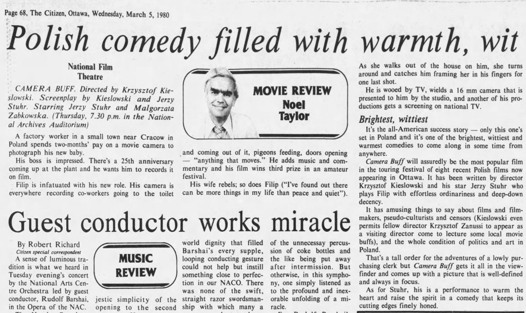 Camera Buff is a significant film in not only Kieslowski’s career but also Polish film, as it is not only a truly transcendent personal work but also a pointed political one, as it carefully criticizes the cloud of censorship that had hung over Kieslowski’s generation. Kieslowski shows the process for a young filmmaker to be a difficult one, as an authoritative hand often shutters an artist’s personal vision.