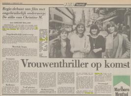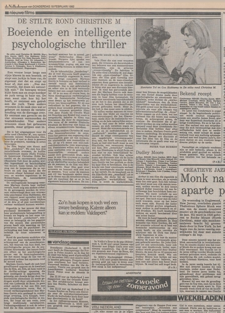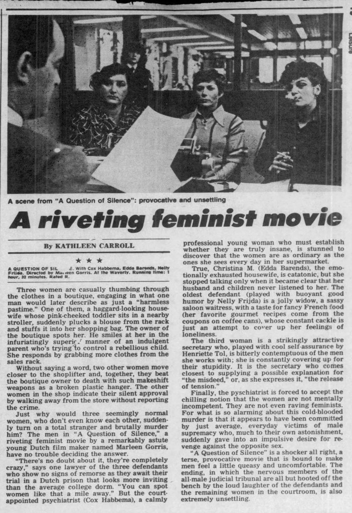 A Question of Silence was highly publicized in the Dutch press in the days leading up to and well after its release. Gorris exclaimed to Algemeen Dagblad in February 1982 (article scanned below) how smoothly the filming had gone and how particularly memorable it was to shoot in “a still vacant tower of the Amsterdam Bijlmer prison” where “real members of the security staff joined” the cast and crew. Perhaps tellingly she noted the only minor issue was having issues casting some of the male roles because of certain actors’ hesitation with the defiantly feminist material.