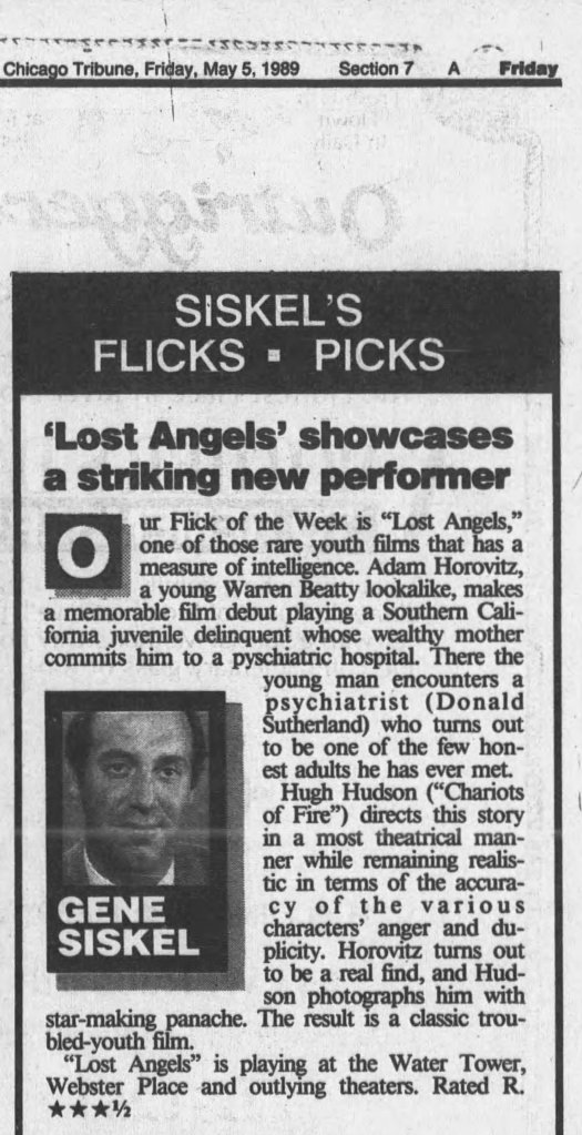 Ebert’s partner across the aisle, Gene Siskel, was amongst the critics who loved the film calling it an absolute “classic troubled youth film” in his near four-star review, especially praising Horovitz as a real “find.” Siskel was amongst the few American critics completely won over by the film but that wasn’t true in France, where Lost Angels made much more of an impact thanks to its strong showing at Cannes (although boos were heard at its screening). A defiant Hudson appeared at the Festival calling his film deliberately “confrontational” and he wanted it to be “upsetting” to the middle and upper class. Most shockingly, Hudson admitted that the film was also an indictment against himself, “a successful middle classed man who in some ways put his career before family.”