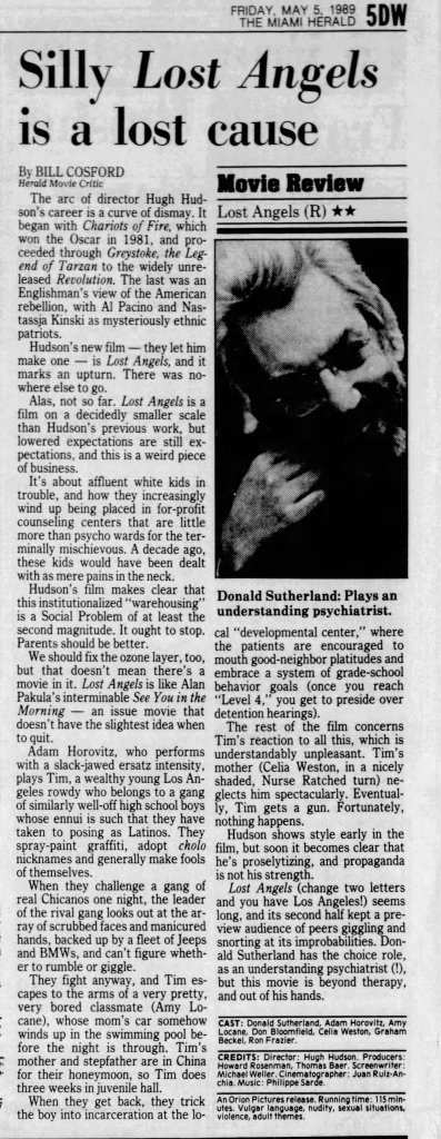 Lost Angels received minor pre-release coverage in the spring of 1989 leading up to its successful Cannes premiere. A lengthy profile of Donald Sutherland appeared in The Santa Cruz Sentinel by Rick Chatenever. The remarkable Sutherland previously worked with Hudson in Revolution and it is much to his credit that he returned to the fold after that film’s violent reception. Praising Hudson’s message with the film, Sutherland noted, “Movies basically don’t change anything. They follow. If this one could be some kind of catalyst, that would be wonderful. And if it could provide people with entertainment, that would be even better.” Horovitz was also quoted in the lengthy profile, which can be read below: