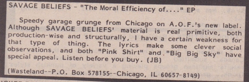 Savage Beliefs formed in Chicago in 1982 and quickly became one of the midwest’s great hardcore bands, even though their recorded output at the time was limited to an E.P. and a compilation appearance. Partially appearing from the fires of D.C.’s ferocious Government Issue, Savage Beliefs became a real favorite to young Steve Albini, whose legendary Big Black too notes from. Indeed, bassist Dave Riley joined Big Black after Savage Beliefs broke up and Albini appeared behind the mixing board for the Big Big Sky compilation. Both the compilation and unreleased film, show Savage Beliefs as one of the great lost American bands of the eighties. The band’s Facebook page features some great information and links for any interested in learning more about the band.