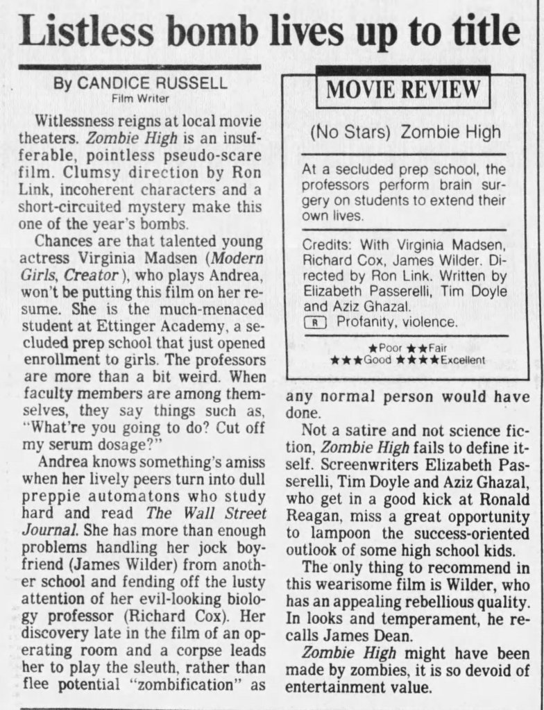 The title Zombie High might have been the film’s undoing, as it’s misleading on a number of levels. Critics who bothered reviewing the film certainly couldn’t see past it, as a barrage of poor notices also damaged its release. Critics and title be damned, though, Zombie High is an extremely perceptive film and stands as a great message for young people to embrace individuality and open mindedness, and to not become another one of America’s conservative douche bags whose only motivating factor is the almighty dollar.
