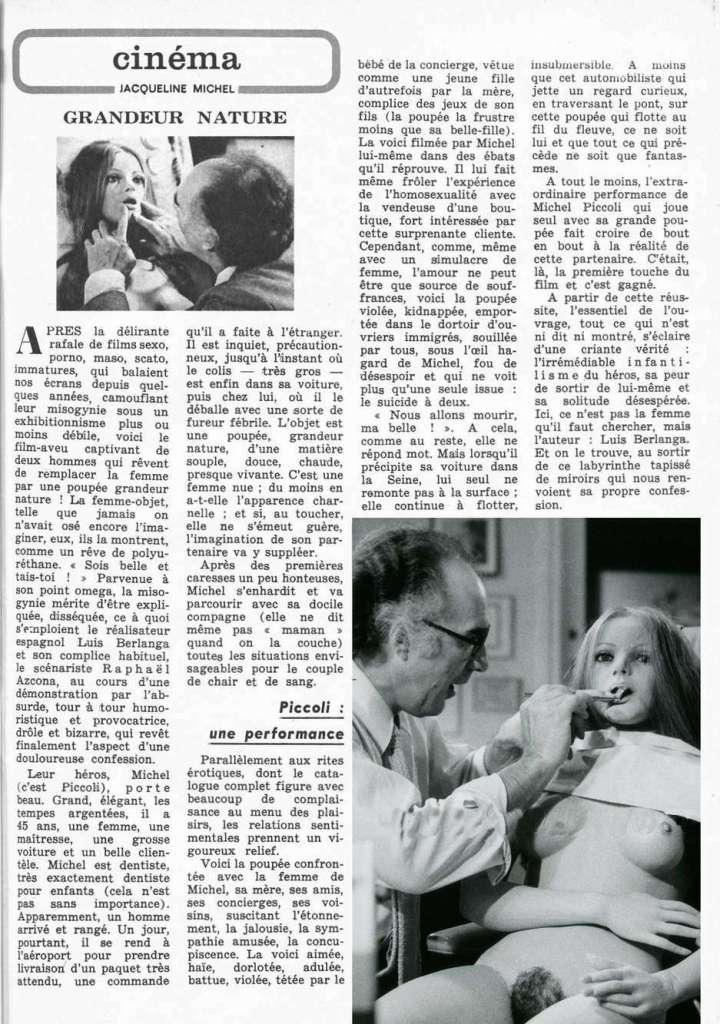 LIFE SIZE is actually the first film from Luis García Berlanga I’ve seen and I was deeply impressed by the film and his work. A veteran with decades of filmmaking already behind him in 1974, Berlanga was approaching his mid-fifties when he adapted the screenplay of LIFE SIZE from a controversial book, along notably with legendary Bunuel collaborator Jean-Claude Carrière and another great figure, Rafael Azcona. These three legends came up with a wild and witty script absolutely brilliant in its savagery and with Michel, the three screenwriters and Piccoli developed a truly perverse and unsettling character, occasionally charming and always horrifying.