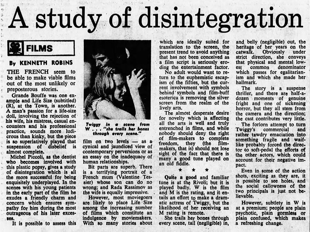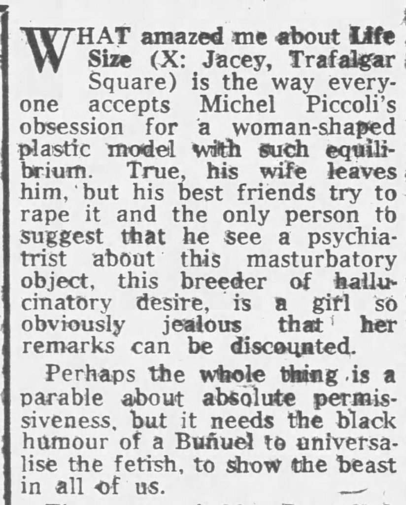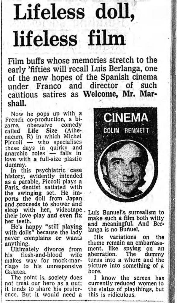LIFE SIZE was buried before it had any sort of real opportunity to shock the people who deserved shocking. Made in France while Berlanga was still under Franco’s strongarm, Spanish censors told him to take a flying leap and the film went unreleased there for nearly five years. After some initial critical support in France, from what I can gather ultimately it only found its way to a small number of theaters and flopped, a Piccoli later lamented.