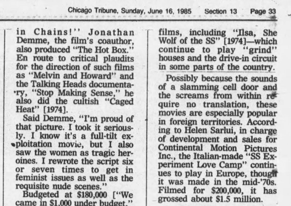 Eight years after its notorious initial release in 1977, Sergio Garrone’s (Lager SSadis Kastrat Kommandantur) (SS Experiment Love Camp) was still making international headlines when unsuspecting readers of The Chicago Tribune were introduced to the film via Pat H. Broeske’s June, 1985 expose on Women in Prison films. Interviewing Continental Motion Pictures’ Development and Sales lead Helen Sarlui, the article noted Garrone’s film was still playing in Europe nearly a decade after its release and had grossed a whopping 1.5 million on a 200,000 budget.