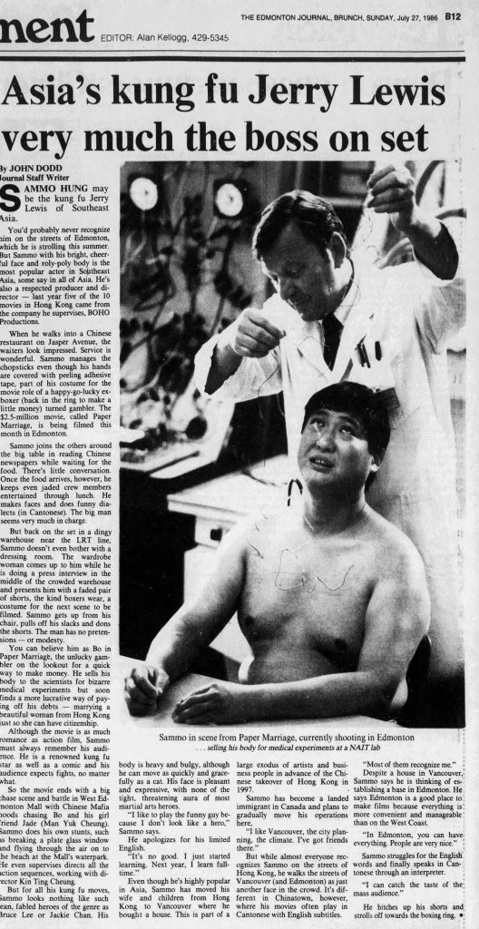 An energetic battle of the sexes action/comedy from director Alfred Cheung Kin-Ting, PAPER MARRIAGE (1988) combines the sizeable talents of Sammo Hung and Maggie Cheung in a fitfully funny and nicely shot production. Shot mostly in Alberto, Canada in 1987 for a spring, 1988 Hong Kong release, PAPER MARRIAGE mostly survives due to the combined charisma of its stars save for one truly fantastic late film sequence shot on location at the West Edmonton Mall.