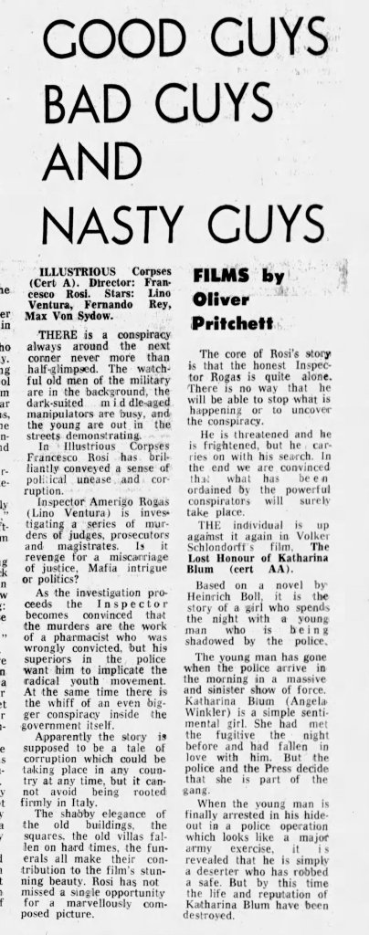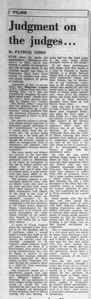 Well into his fifties with more than ten features already under his belt, Rosi was already well-established by 1976 when he directed Illustrious Corpses. His direction here is sublimely unpredictable, much like everything else about the film. There is one scene for example featuring a terrifying Alain Cuny as a judge suddenly smashing his own hand against a marble bathroom sink for no discernable reason. My man Alex Cox featured on the audio commentary inquires why he does that and why does Rosi show it? There is no clear answer. It’s an unsettling moment in an unsettling film filled with unsettling moments.