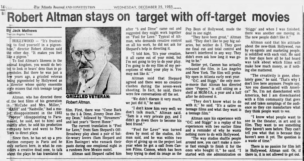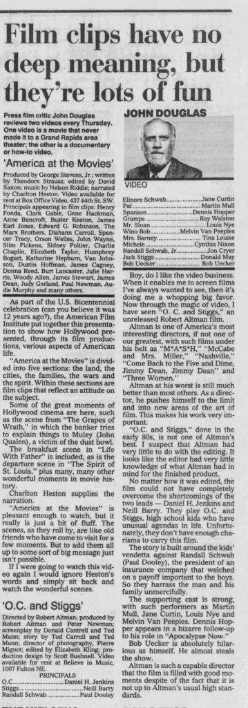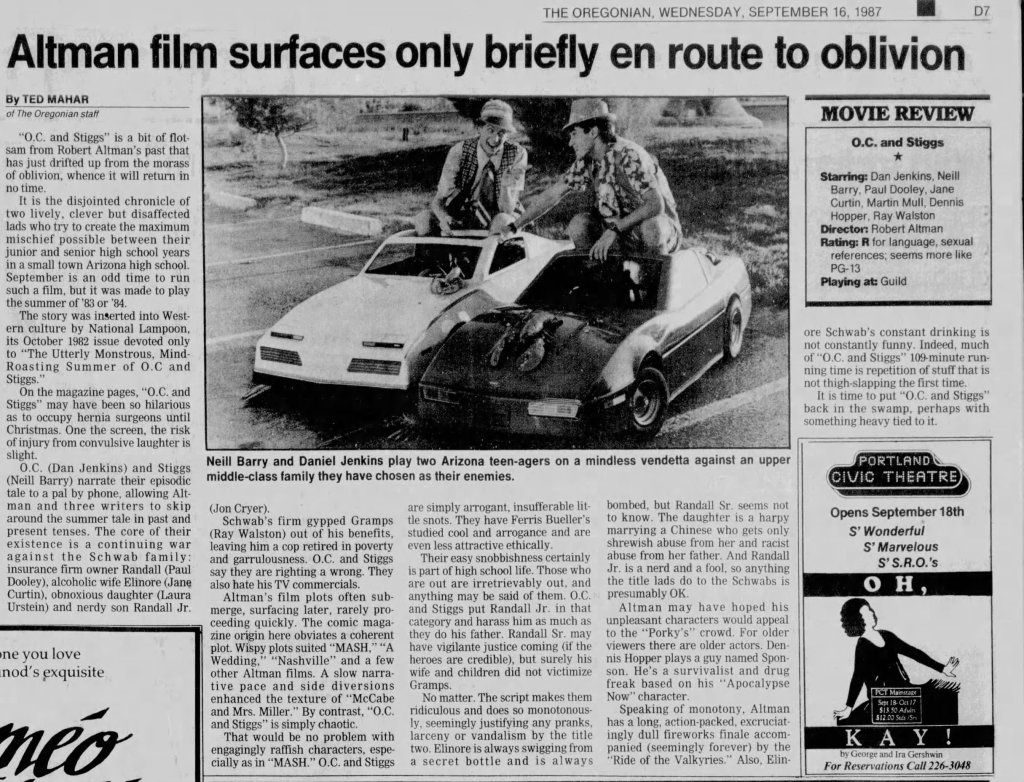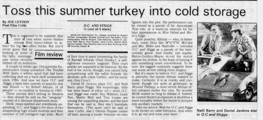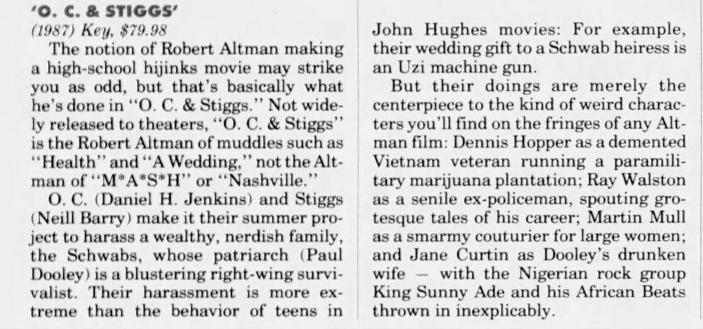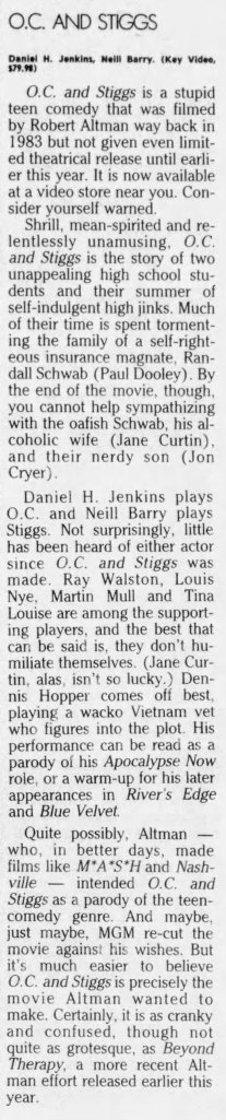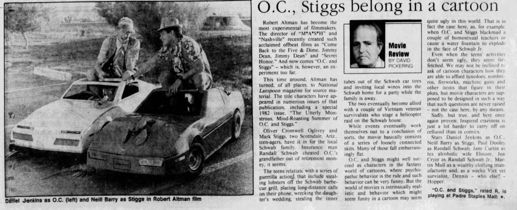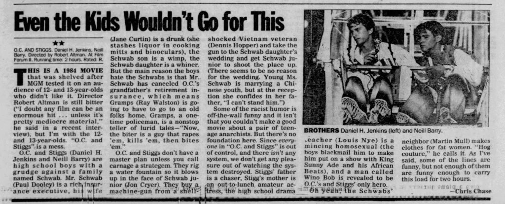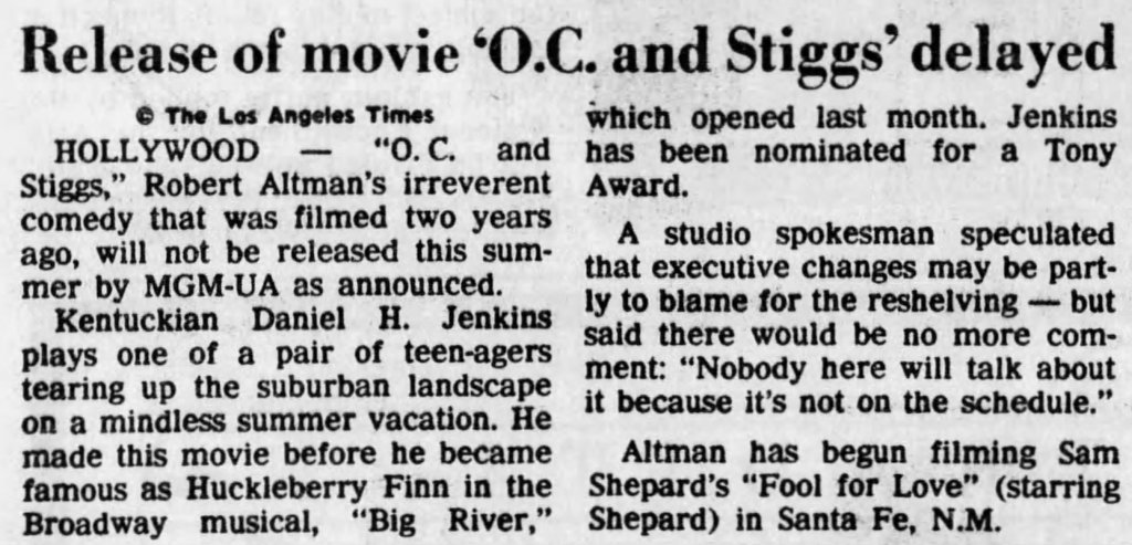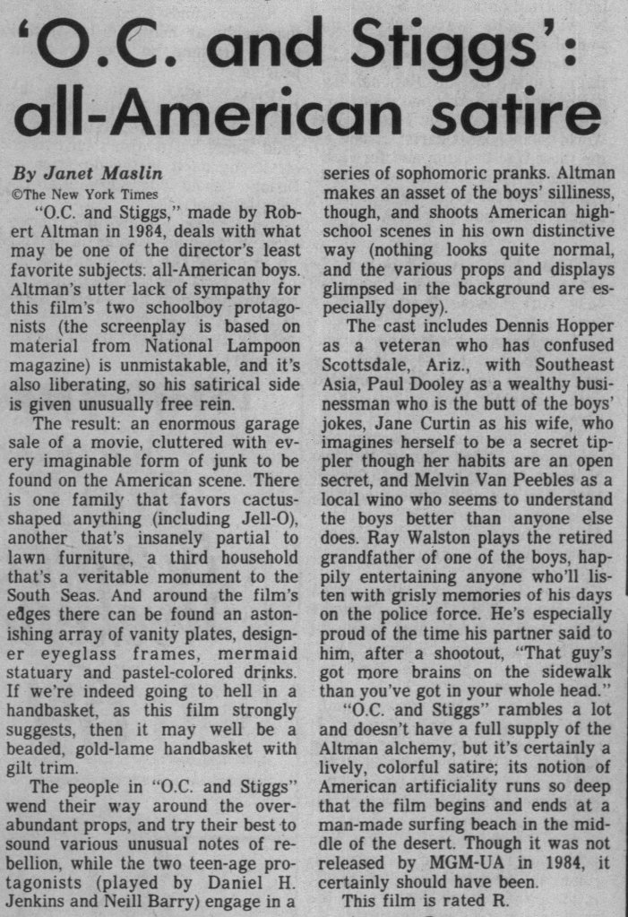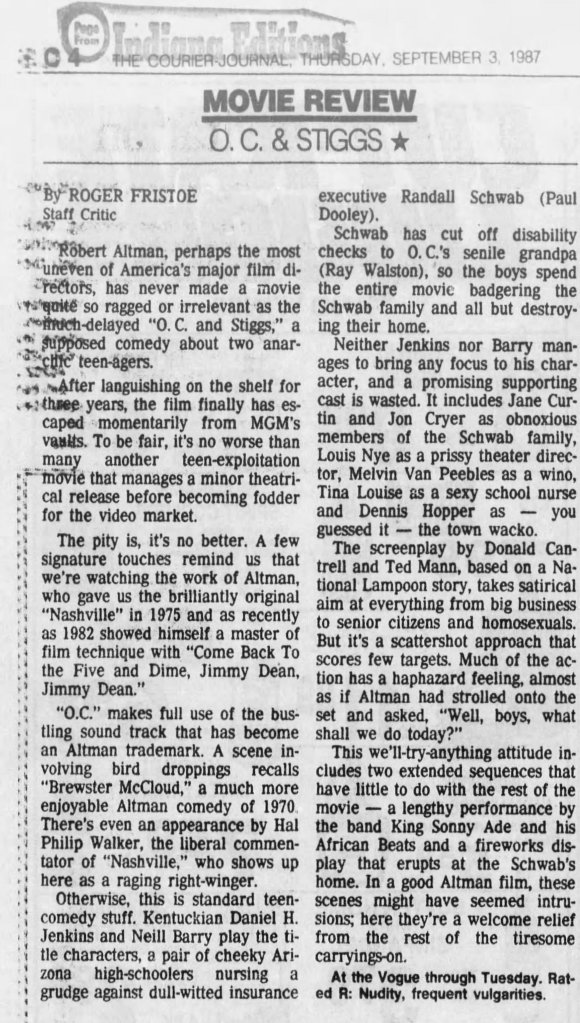 Before I write about some of my thoughts on Robert Altman and specifically O.C. and Stiggs, let me first get some positives out of the way. Altman was a terrific filmmaker who made some of the greatest American films and he continued making interesting films all the way up to the end of his career. His penultimate film The Company (2003) starring Neve Campbell is a real personal favorite of mine for example. As for O.C and Stiggs, the film has a wonderful soundtrack and its musical numbers based around King Sunny Adé and His African Beats are splendid. Cast wise, both leads deliver appealingly energetic turns, including my fellow Kentuckian Daniel H. Jenkins as O.C. (I’ve included some vintage KY clippings about his casting at the end of this piece, along with dozens of others I found). The film also contains some good examples of Altman-Speak with characters talking over each other despite the fact that he had no hand in the screenplay. Finally, David Gropman’s deliberately tacky visual design plays in well with the film’s satirical stance. While I find the revisionist history about some of Altman’s most catastrophic failures disappointing, O.C. and Stiggs has some good qualities but…