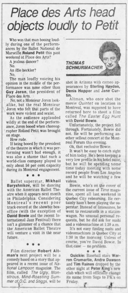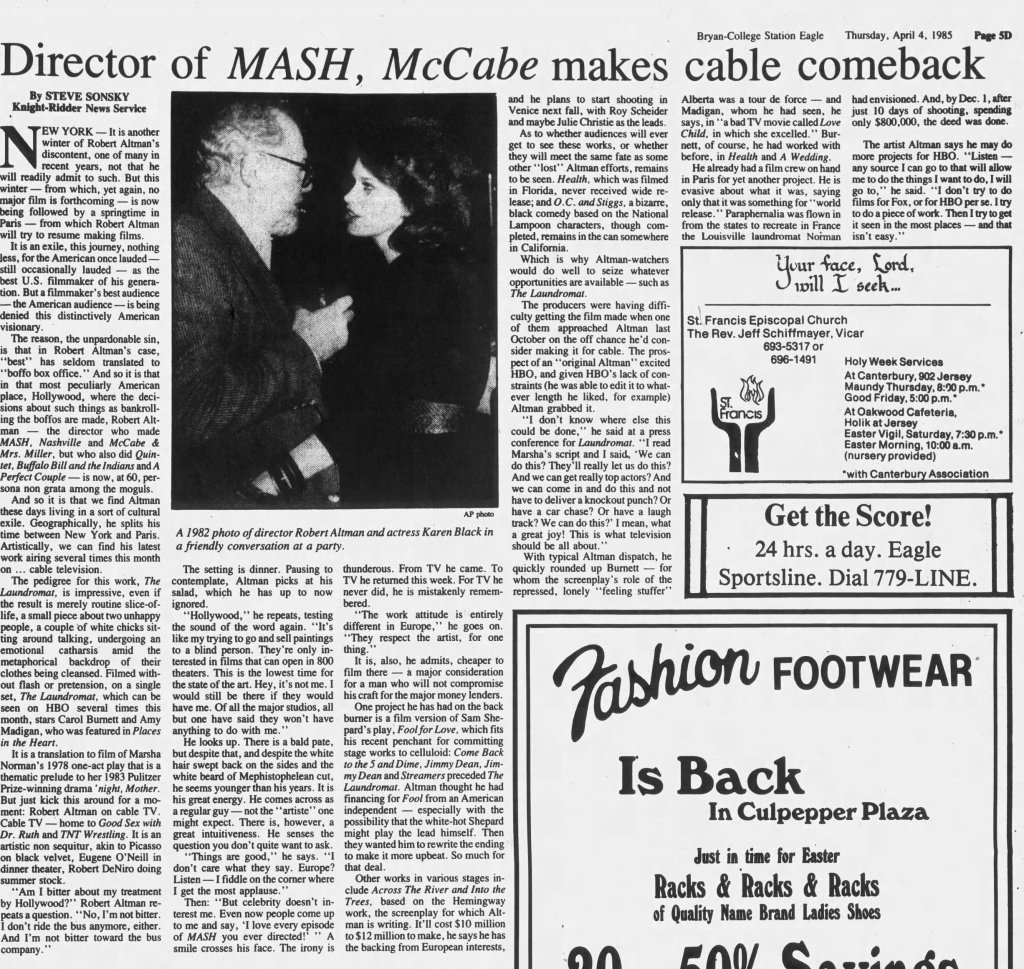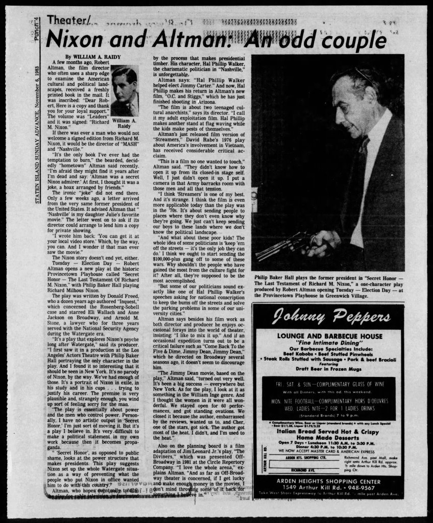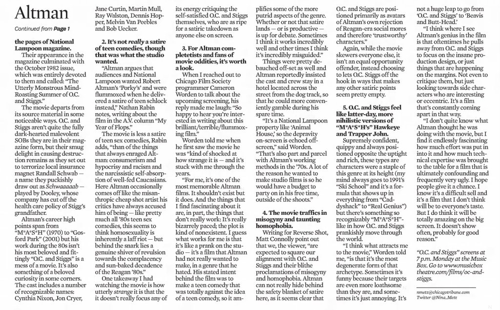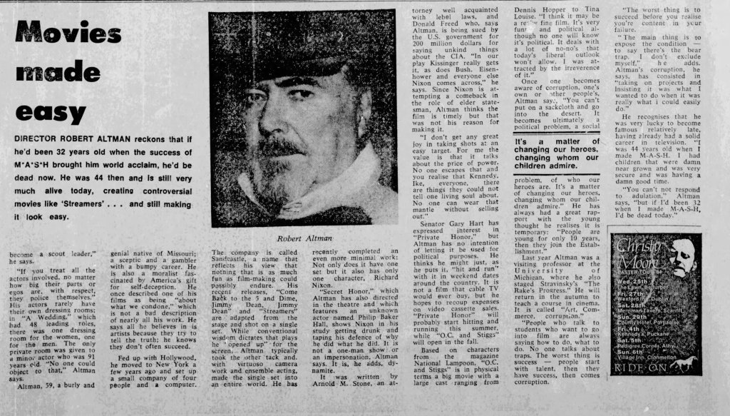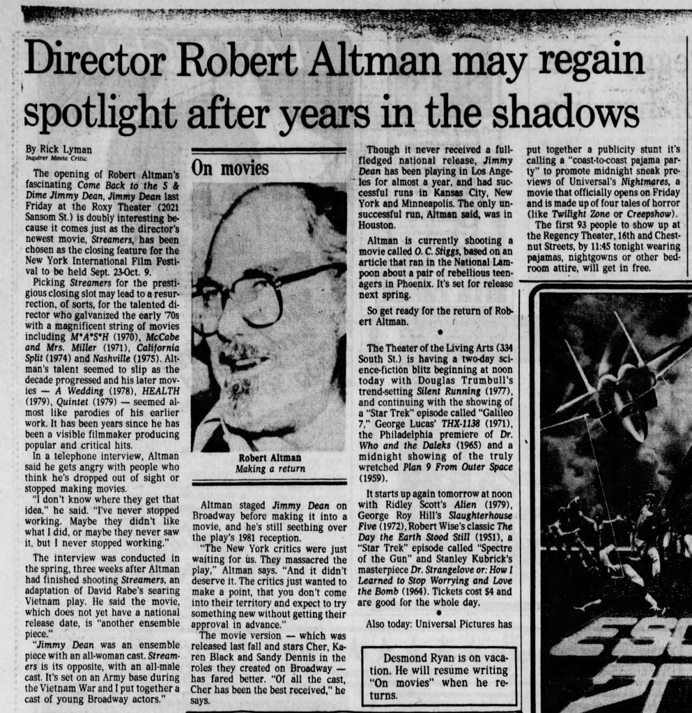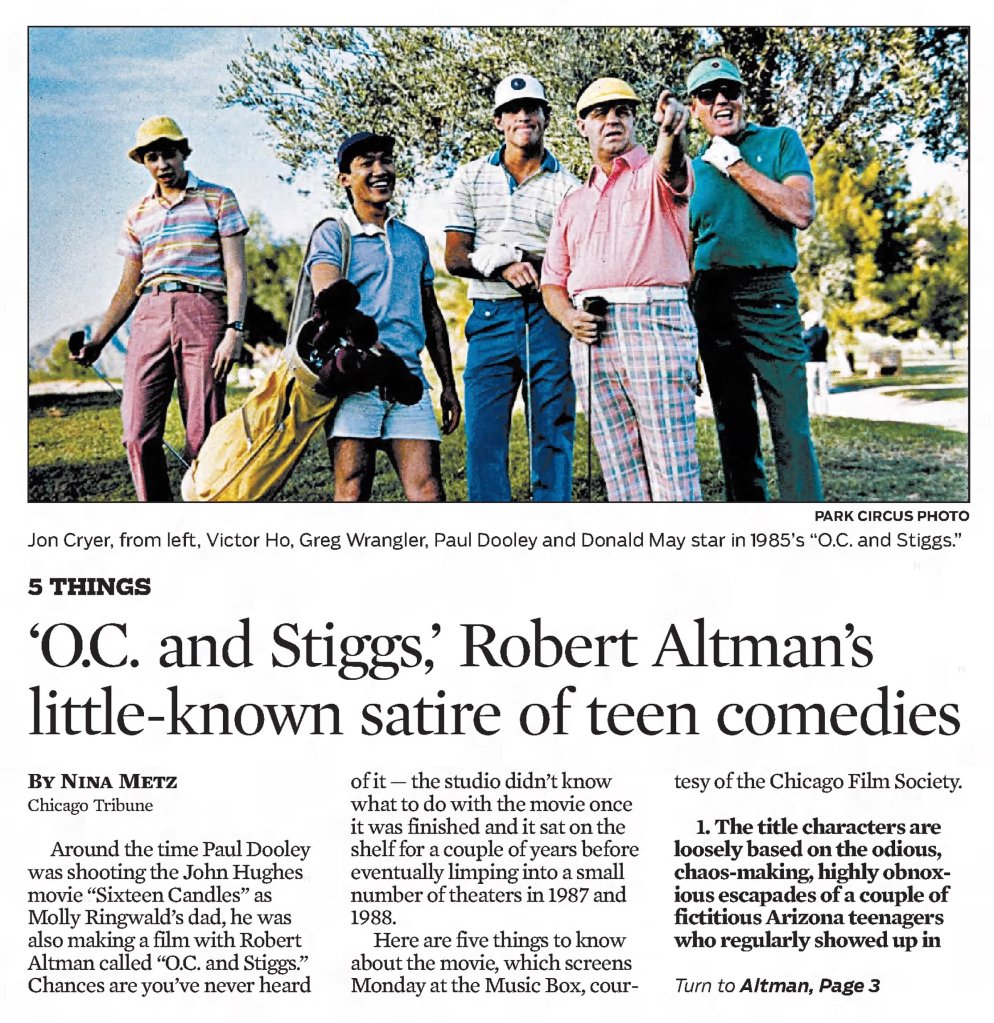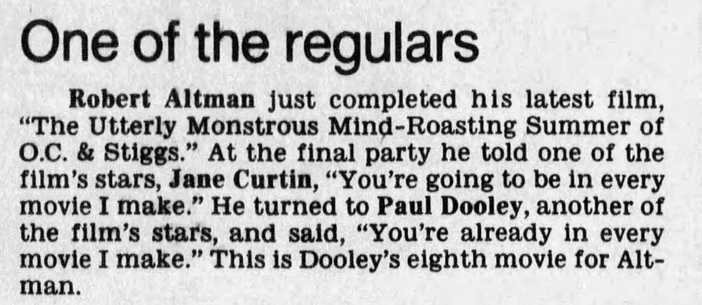Before I write about some of my thoughts on Robert Altman and specifically O.C. and Stiggs, let me first get some positives out of the way. Altman was a terrific filmmaker who made some of the greatest American films and he continued making interesting films all the way up to the end of his career. His penultimate film The Company (2003) starring Neve Campbell is a real personal favorite of mine for example. As for O.C and Stiggs, the film has a wonderful soundtrack and its musical numbers based around King Sunny Adé and His African Beats are splendid. Cast wise, both leads deliver appealingly energetic turns, including my fellow Kentuckian Daniel H. Jenkins as O.C. (I’ve included some vintage KY clippings about his casting at the end of this piece, along with dozens of others I found). The film also contains some good examples of Altman-Speak with characters talking over each other despite the fact that he had no hand in the screenplay. Finally, David Gropman’s deliberately tacky visual design plays in well with the film’s satirical stance. While I find the revisionist history about some of Altman’s most catastrophic failures disappointing, O.C. and Stiggs has some good qualities but…