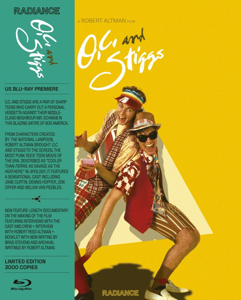 Making its stateside Blu-ray debut, Robert Altman’s O.C. and Stiggs (1987) is now available from Radiance via their once Region B locked 2023 restoration. Featuring a very nice HD transfer and extensive extras, this limited edition release about a pair of anarchic teenagers looking to get revenge on a rich uptight neighbor gives American Altman fans an opportunity to own one of his most controversial and polarizing productions in HD. Despite reservations any might have about the film, this Radiance Blu-ray is a quality release and it is hard to imagine a better one ever appearing for admirers of O.C. and Stiggs.