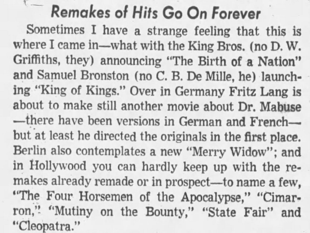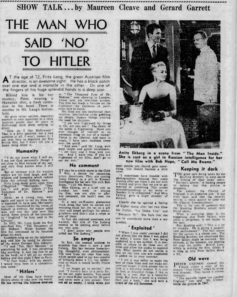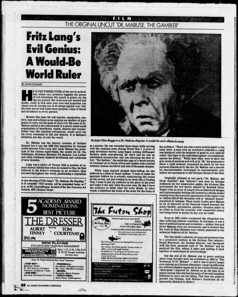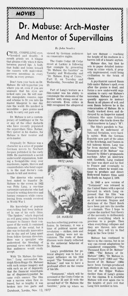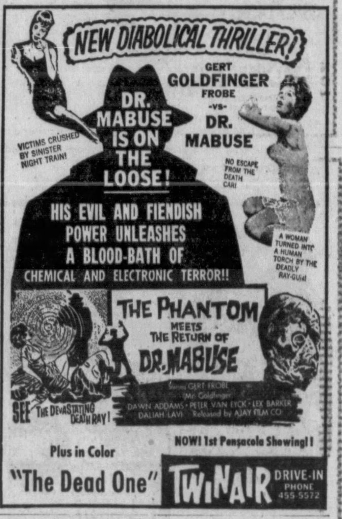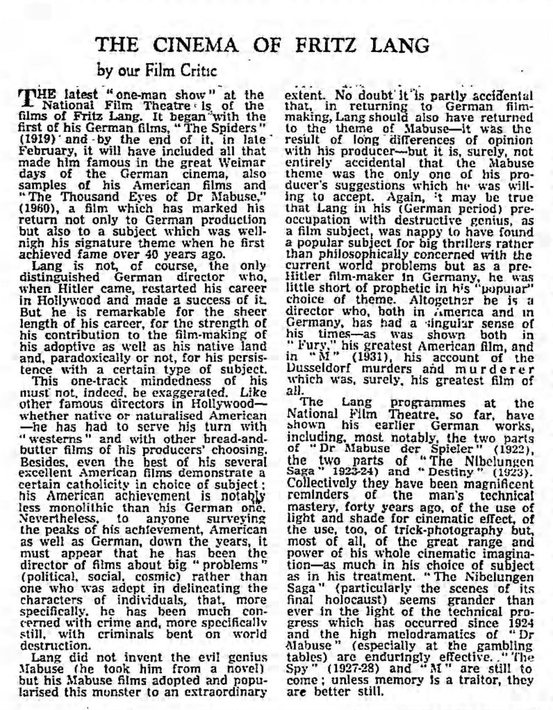 Newly available from Eureka, the 4-disc box Mabuse Lives! Dr. Mabuse at CCC: 1960-1964 is a comprehensive and excellent collection highlighting the return of a fictional cinematic legend. Featuring new 2K restorations of The Thousand Eyes of Dr Mabuse (1960), The Return of Dr. Mabuse (1961), The Invisible Dr. Mabuse (1962), The Testament of Dr. Mabuse (1962), Scotland Yard Hunts Dr. Mabuse (1963) and The Death Ray of Dr. Mabuse (1964), Mabuse Lives! is an exciting new box-set featuring beautifully restored prints and a wealth of new extras. Available directly from Eureka and MVD, Mabuse Lives! is a highly recommended set. Below are my capsule Letterboxd reviews along with some additional clippings I discovered.