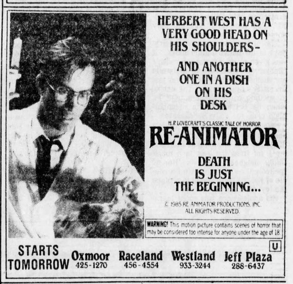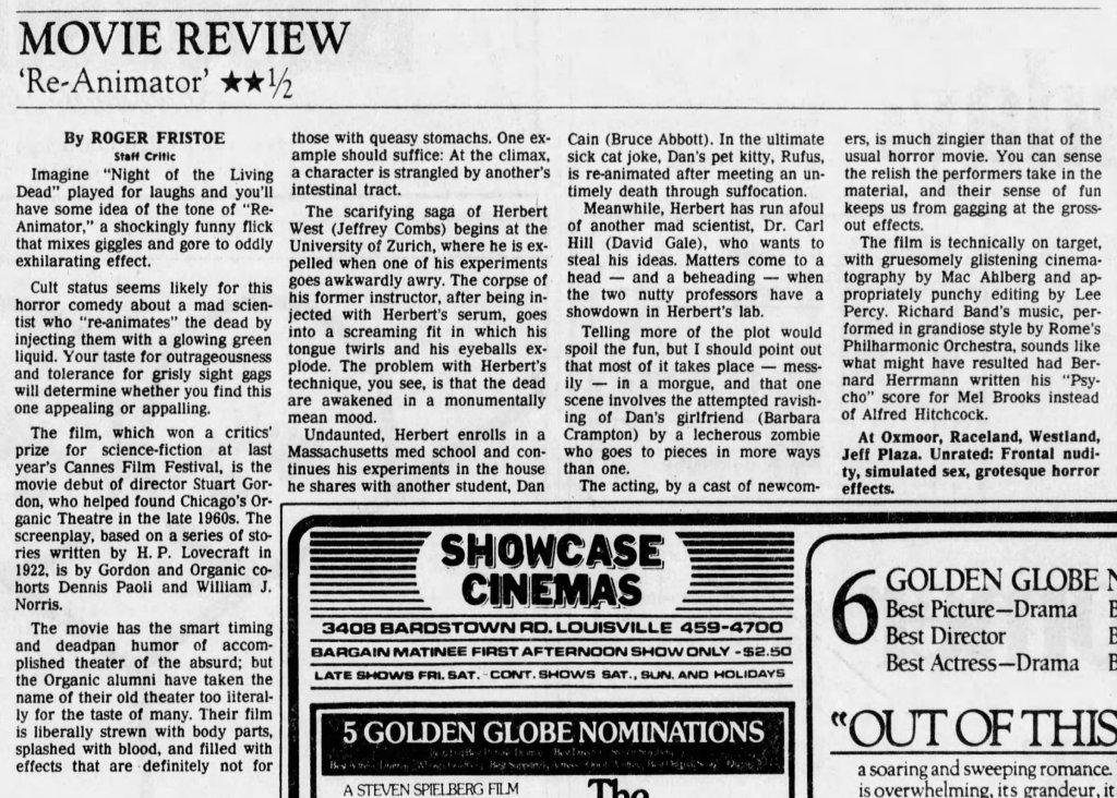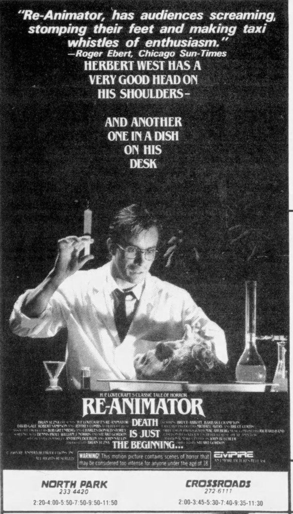 Ignite Films and Eagle Rock Pictures have released the absolute greatest version of Stuart Gordon’s classic Re-Animator (1985) as a beautiful 4K/Blu-ray collection. My highest recommendation possible for this incredible restoration, featuring two cuts of the film and an amazing abundance of bonus features. This is amongst the greatest archival releases of the decade. Here are a few thoughts on one of my favorite films, along with some local Indiana/Kentucky clippings from my youth I located.