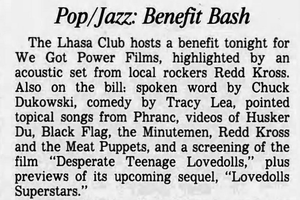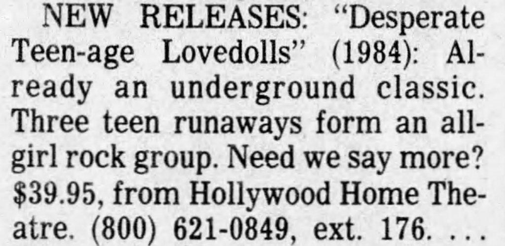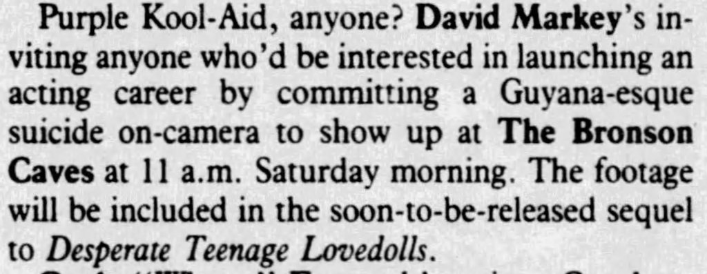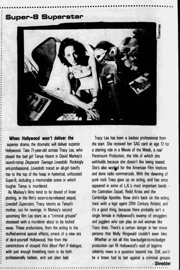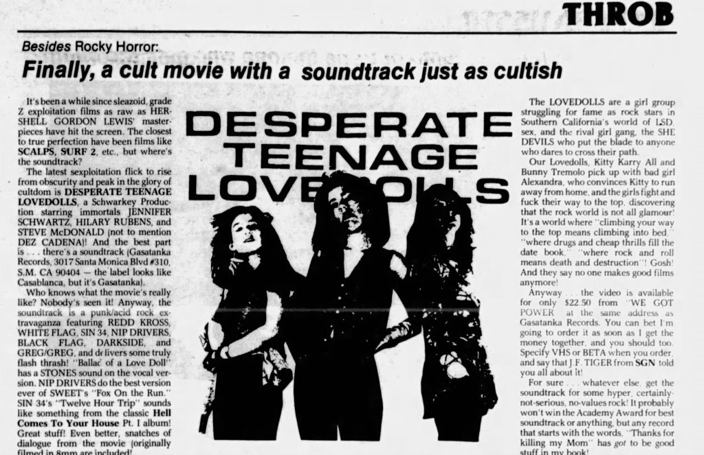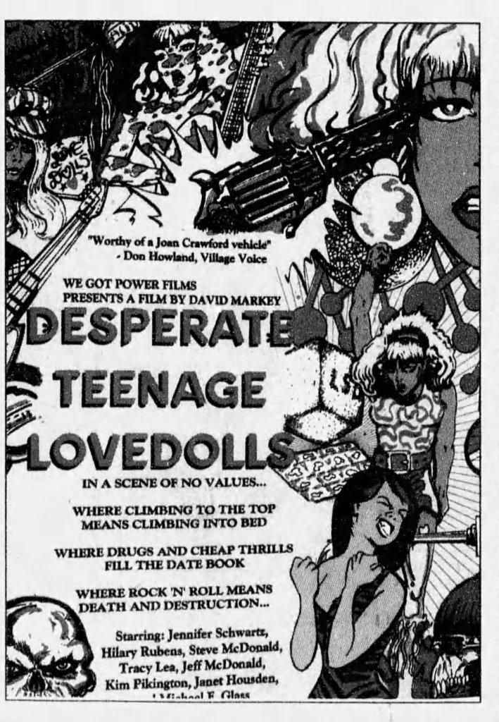 Like a lot of Gen X kids, I first saw Markey’s awesome little punk-rock epic on VHS. Whether you were a punk kid, metalhead, or just a general part of a J. Mascis “Freak Scene” style group, somewhere a copy of Desperate Teenage Lovedolls was trading hands nearby. It is one of the few films that matched the sloppy energy of our collective record collections and, best of all, it felt authentic. I was watching this shit as a suburban midwest kid, and it made me feel a part of a wild scene I’d only read about in the pages of Maximum Rock n Roll.