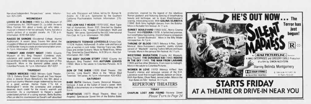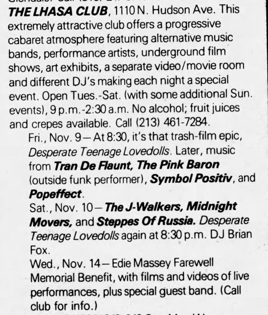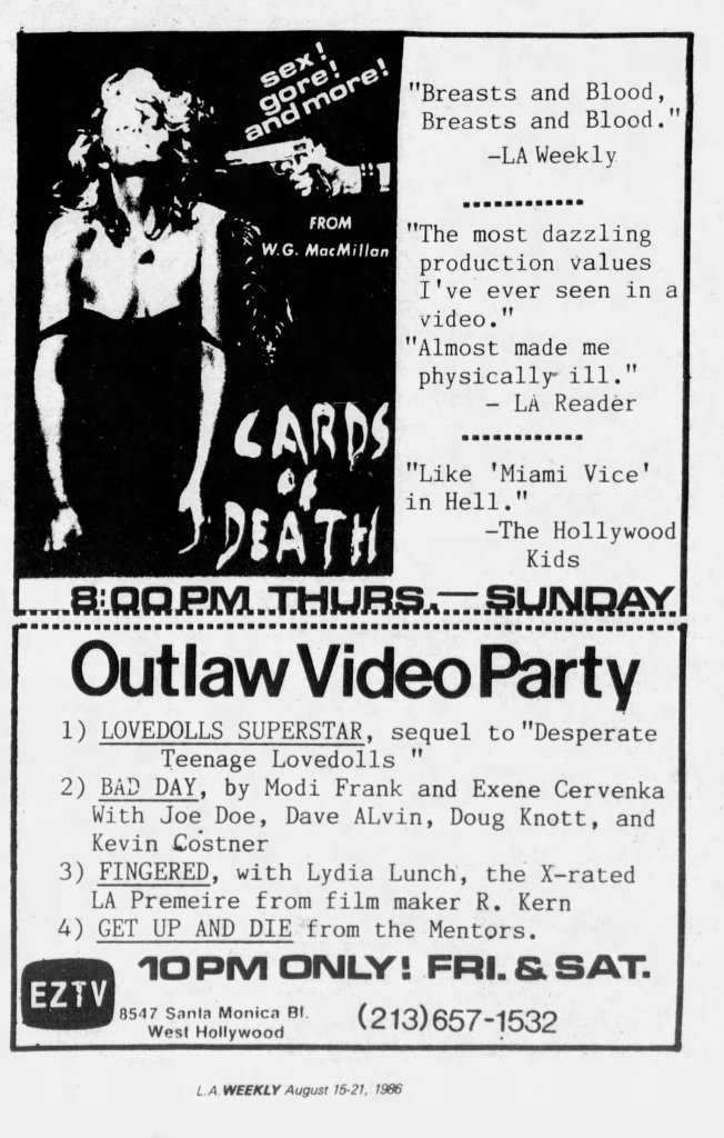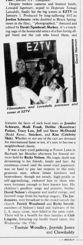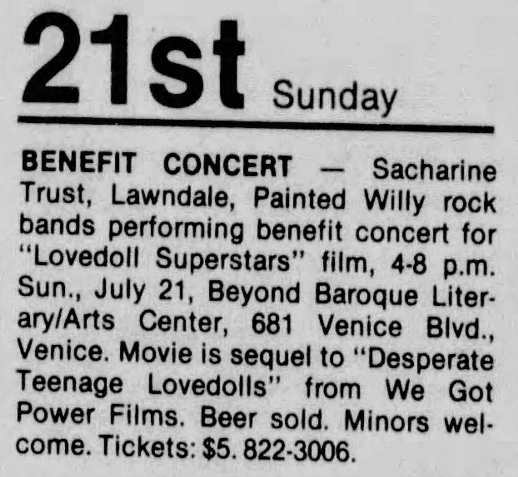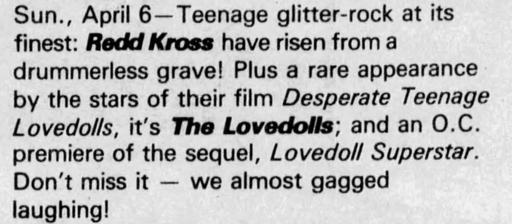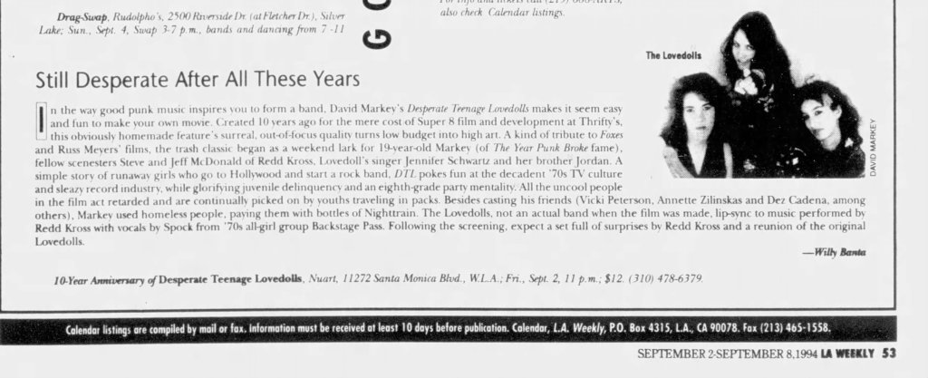 Although several decades have slipped away since Desperate Teenage Lovedolls, Markey’s film remains as vital as the recordings of X, Black Flag, Dead Kennedys, or any other trailblazing Punk band of the period. Desperate Teenage Lovedolls is also just a great tribute to the power of a group of broke but passionate friends who get a movie made just because they goddamn want to. In the immortal words of Black Flag, Markey and his entire small team “Rise Above” the need for any type of corporate sponsorship or compromise. Desperate Teenage Lovedolls is one of the most authentically Punk movies ever made.