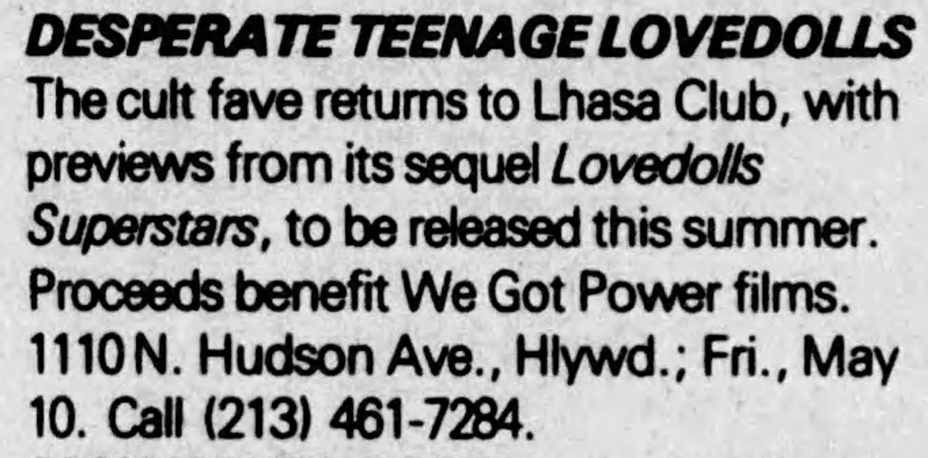The only complaint I’ve ever had about Desperate Teenage Lovedolls is its brief run-time. Somewhere between a short and a feature, Desperate Teenage Lovedolls has a lot more story to tell, one reason the sequel remains so necessary. The film’s brief runtime made it perfect for high school and college parties. It also allowed the film to be screened alongside local punk gigs and made it perfect for Midnight double-bills, all of which is to say Markey made the correct call regarding the film’s levity. I’m just so grateful for the follow-up.