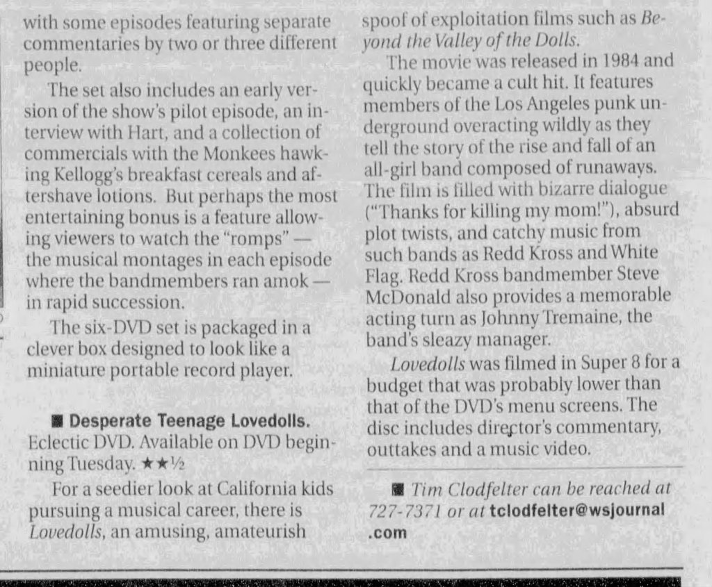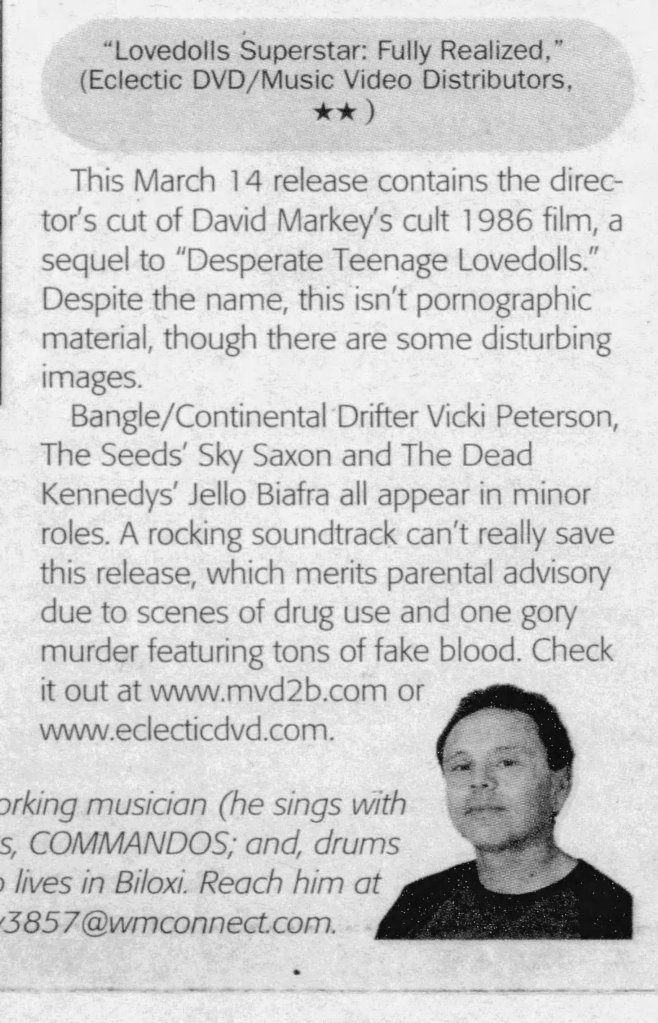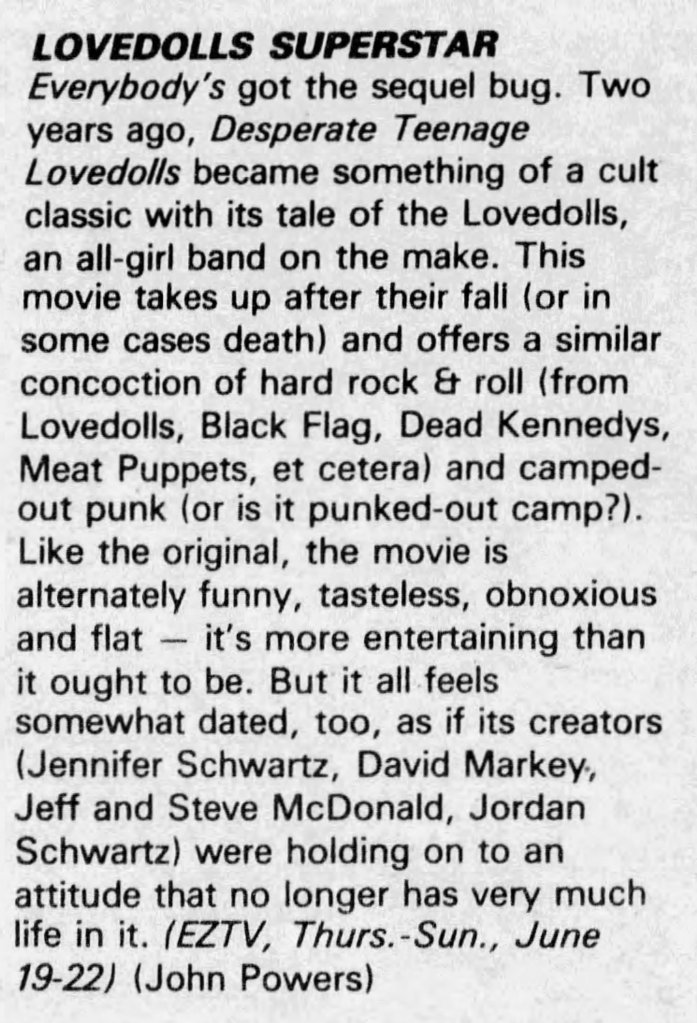 Lovedolls Superstar absolutely deserves to be as well-known as Desperate Teenage Lovedolls. Even though I don’t have the same nostalgic feel for the film as the original, since I discovered it later in life, I simply admire and enjoy this more. Curse the cinematic Gods for not allowing Markey to make his proposed third entry in the series.