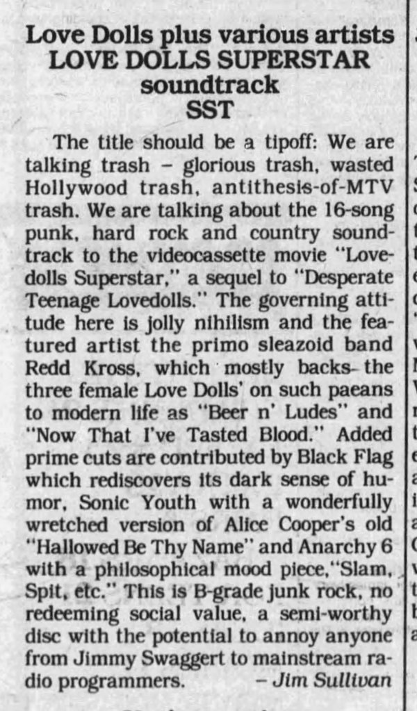 Like the original, the soundtrack to Lovedolls Superstar is as essential as the film itself. Redd Kross returns, and the likes of legendary bands like Sonic Youth, along with a slew of Hardcore and Punk bands, can be heard on the soundtrack.